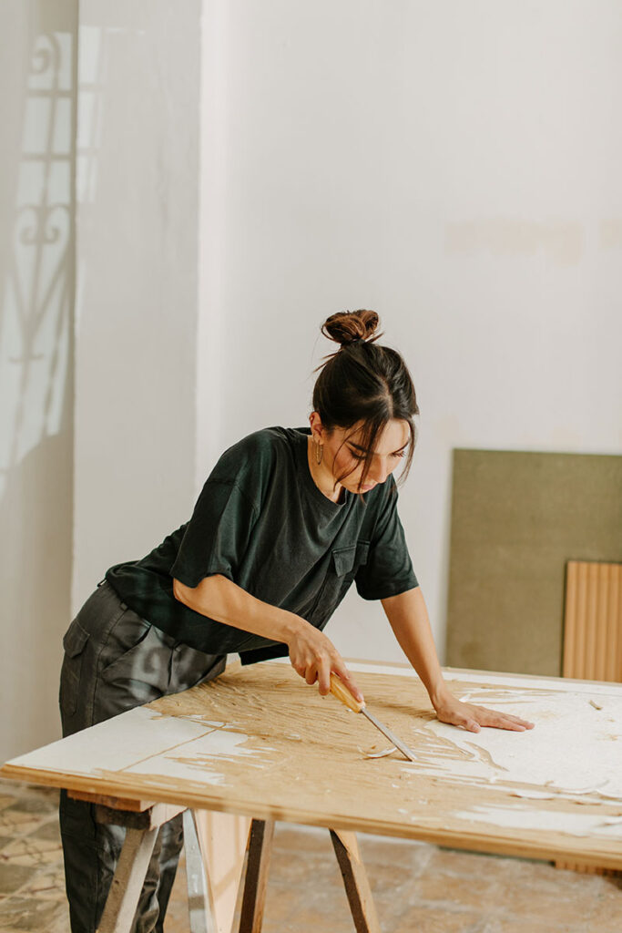 Su trabajo aborda diversas cuestiones surgidas de una producción artística de carácter procesual, basada en la observación y el cuestionamiento activo de su entorno, generalmente desde el espacio donde trabaja: un antiguo taller de ebanistería en Valencia. Este espacio funciona como fuente de materiales, objetos y formas que se encuentran alejados del contexto actual y que pretenden ser reactivados desde una perspectiva consciente de su tiempo y de su medio. Adopta un enfoque arqueológico que implica un desarrollo de construcción y experimentación, donde explora los límites, lo oculto y los restos generados a lo largo del proceso de un medio. Además, presta especial atención a los diferentes métodos de producción y fabricación, así como a la cultura material que emerge tanto del trabajo manual como del industrial. Aborda un sistema de producción que hoy en día resulta extraño, estableciendo un diálogo entre los materiales residuales y los ornamentos encontrados allí en contraste con los materiales industriales.