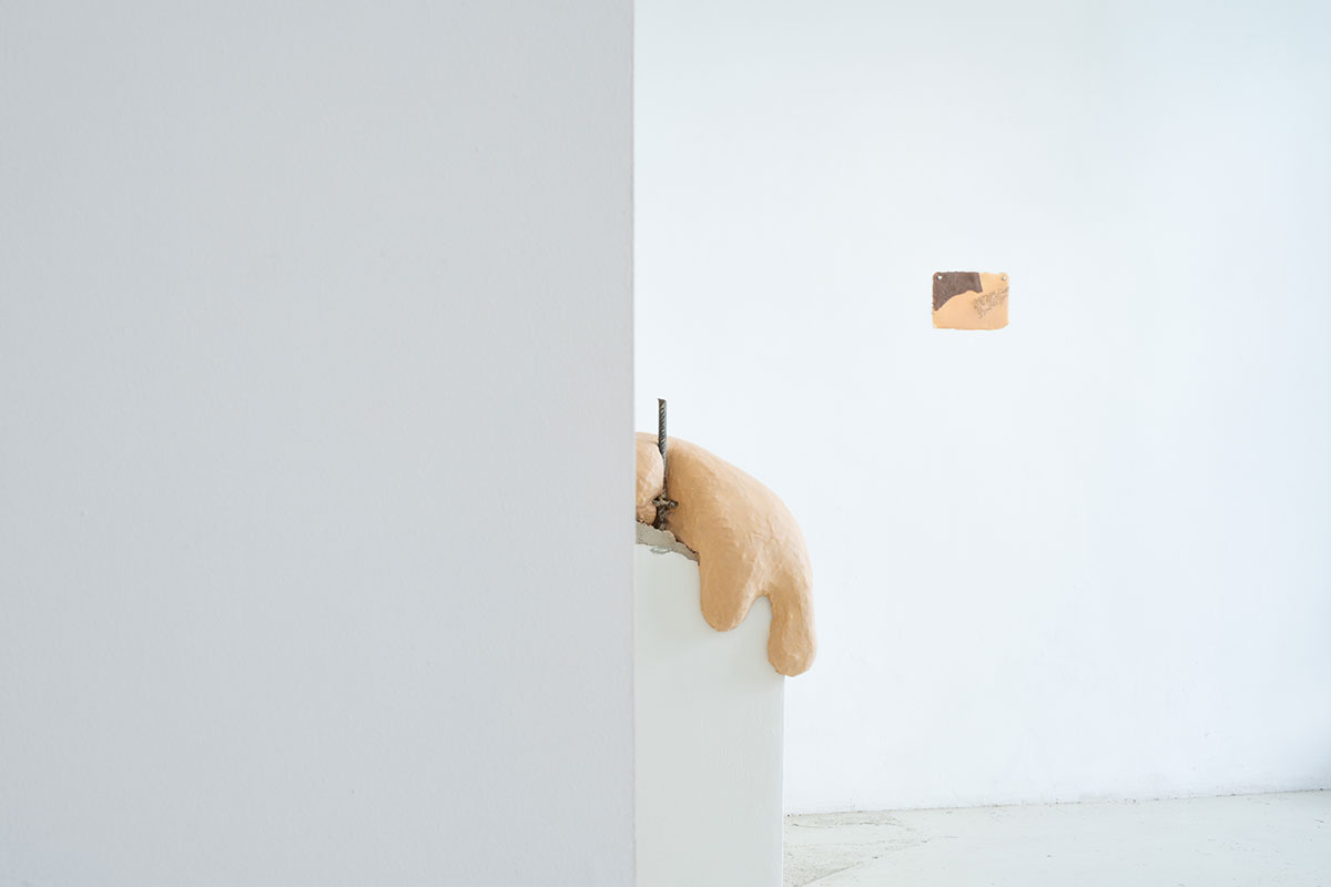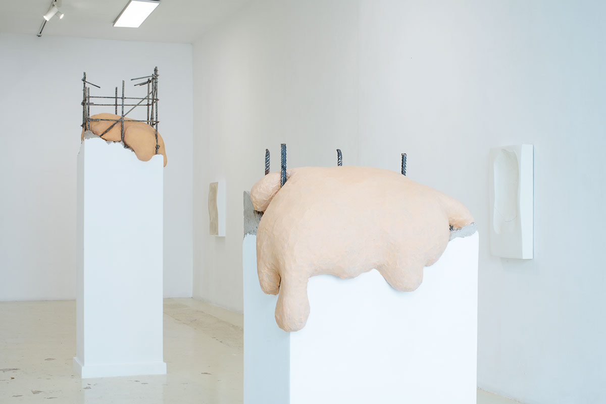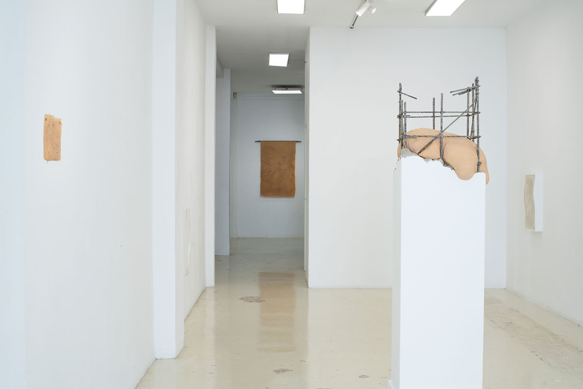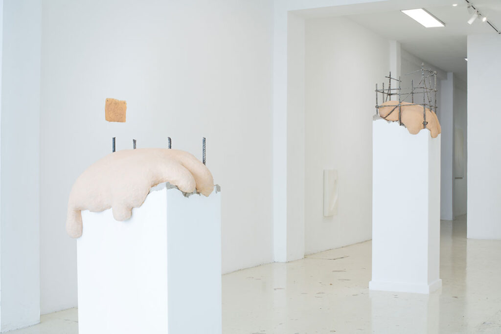 La muestra aborda estas mecánicas a través de un lenguaje metafórico en el que cuerpos bulbosos, blandos, invertebrados, se pliegan y adaptan a las estructuras que las enmarcan; o, por el contrario, proponiendo la acomodación de los muros a la figura humana en forma de huellas o contraformas corporales que redefinen sus límites y configuran un espacio permeable, dúctil y afectivo